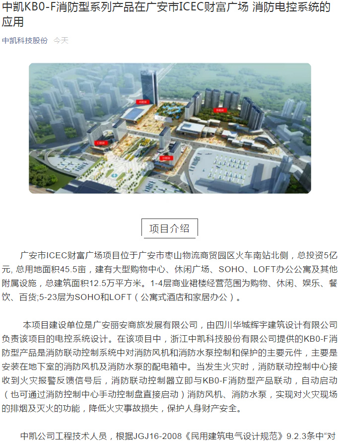 中凱KB0-F消防型系列產品在廣安市ICEC財富廣場 消防電控系統的應用